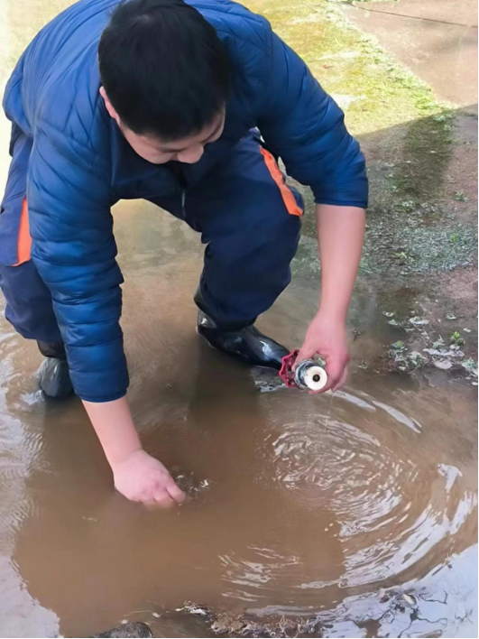 水管爆裂速響應,應急搶修顯擔當。3月初,學生公寓梅苑1棟旁突然水管閥爆裂,時值低溫,李魁顧不上滿地污水,在水中徒手尋找爆管點,即使滿身污漬也毫不在意,有的只是對維修工作的專注和熱情。經過半個多小時的奮力搶修,破裂水管維修完畢,積水被清除,學生寢室陸續恢復供水。
