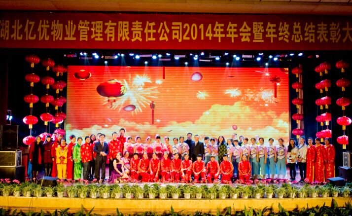 在充滿愛國情懷與正能量的《祝福祖國》舞蹈中,年會拉開了序幕。副校長吳顯富首先致辭,他向三百多個日夜堅守在一線的保安、保潔、維修、公寓管理員表達了新春的問候,對公司2014年工作給予了充分肯定,認為公司2014年經營目標的超額完成是全體員工努力奮斗的結果,希望來年公司上下齊心,再創佳績。總經理楊守平回顧了2014年公司經營、管理、服務等方面工作,肯定了億優人“真心服務、誠心奉獻”的精神風采、“開拓進取、努力創新”的職業追求、“精細管理、追求卓越”的價值取向,他要求所有億優人一如既往地保持大局意識、憂患意識、責任意識,在學校第三次黨代會提出的“增強保障能力、改善服務質量、提升服務品質”精神引導下,以昂揚的斗志和改革的勇氣,釋放正能量,做好億優人,辦好億優事。