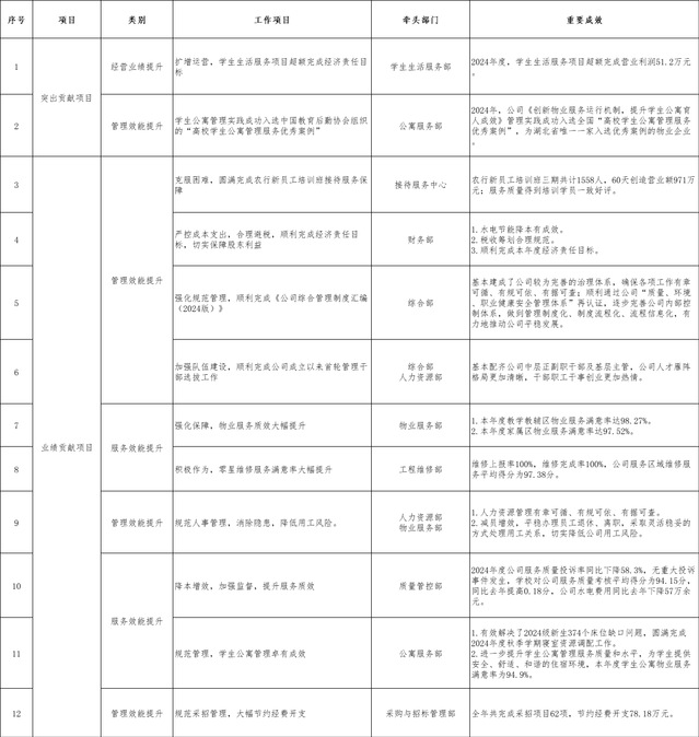 根據《湖北億優物業管理有限責任公司部門年度目標責任管理辦法》(鄂億優物業發〔2024〕38號)有關規定,結合公司2024年目標責任考核結果,經公司黨政聯席會議研究決定,公司2024年發展貢獻業績項目共12項,其中突出貢獻項目2項、業績貢獻項目10項,現予以公示: