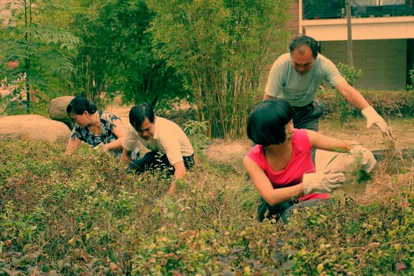 下午3點,艷陽高照。公司領導、總經理辦公室、財務部、公寓服務部、物業服務部、安保部、國際學術交流中心共計40余人,來到汀蘭苑小區中心花園的綠化帶開展義務拔草勞動。由于該綠化帶雜草分布廣,大家按照事先分好的片區和組別,帶上手套和工具,迅速地深入到各自區域開展拔草。有的用手拔、有的用刀鋸割;有的單膝跪地、有的被“淹沒”在樹叢中;遇到草多且泥土硬的地帶就三、五人一起集中力量重點清除;有的上級照顧下屬,把雜草多且土地硬的地帶留給自己;有的員工滿頭大汗,衣服被汗水濕透了也臟了;有的員工花粉過敏,身上起了一塊塊紅疹子;有的員工累彎了腰也沒有歇息過。大家的鞋子、褲腿上沾上了厚厚的黃泥,兩只手套也“涂”上了一層不一樣的色彩......下午5點,中心花園綠化帶周邊的雜草被徹底清除了,雖然大家略顯疲倦,身上滿是泥土,但看著自己的勞動成果,都感到由衷的欣慰。