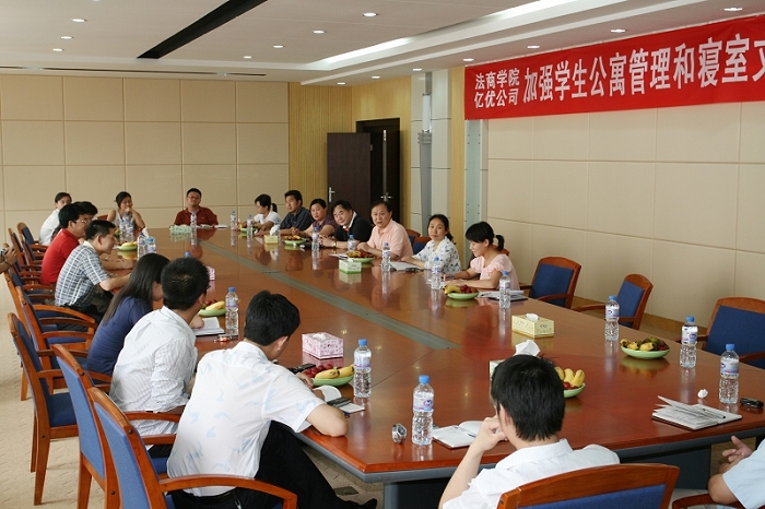 與此同時,億優公司副總經理陳武帶領公寓服務部、物業服務部、工程維修部負責人在法商學院綜合樓三樓會議室參加了法商學院舉行的關于加強學生公寓管理和文化建設座談會,法商學院副院長黃華、學工部副主任謝建國、團委副書記單敏、各系綜合辦主任8人以及來自不同樓棟學生代表共13人參加了座談會。會上,13名學生代表對億優公司的各項服務工作給予了高度評價,同時,對維修、保潔及公寓管理等問題提出了問題和建議,各部門負責人一一作答。陳武副總經理對同學們提出的意見和建議進行分類匯總并要求相關負責人加強落實,予以解決。最后,法商學院副院長黃華對億優公司“全心全意全為您“的服務宗旨給予了充分肯定,并要求同學們養成良好的生活、學習習慣;愛護公共財產,共建文明、和諧學生公寓。