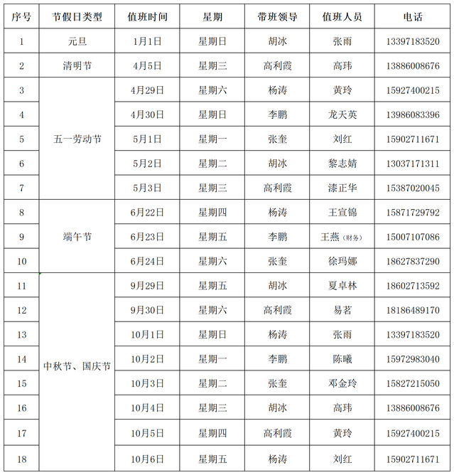 2023年法定節假日值班安排表