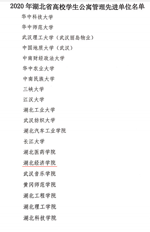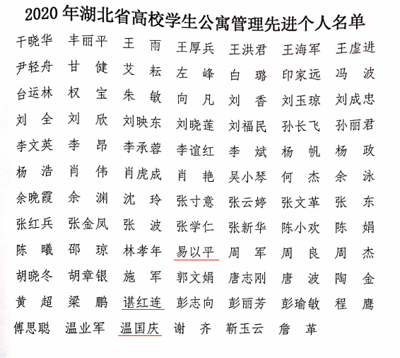 本網(wǎng)訊(通訊員 汪子欣)2020年12月7日,湖北省高等學(xué)校后勤研究會印發(fā)了“關(guān)于表彰2020年湖北省高校學(xué)生公寓管理先進(jìn)單位和先進(jìn)個人的決定”。我校榮獲“湖北省高校學(xué)生公寓管理先進(jìn)單位”榮譽(yù),桔九管理員易以平、桔五管理員諶紅連以及桂一管理員溫國慶榮獲“湖北省高校學(xué)生公寓管理先進(jìn)個人”榮譽(yù)。