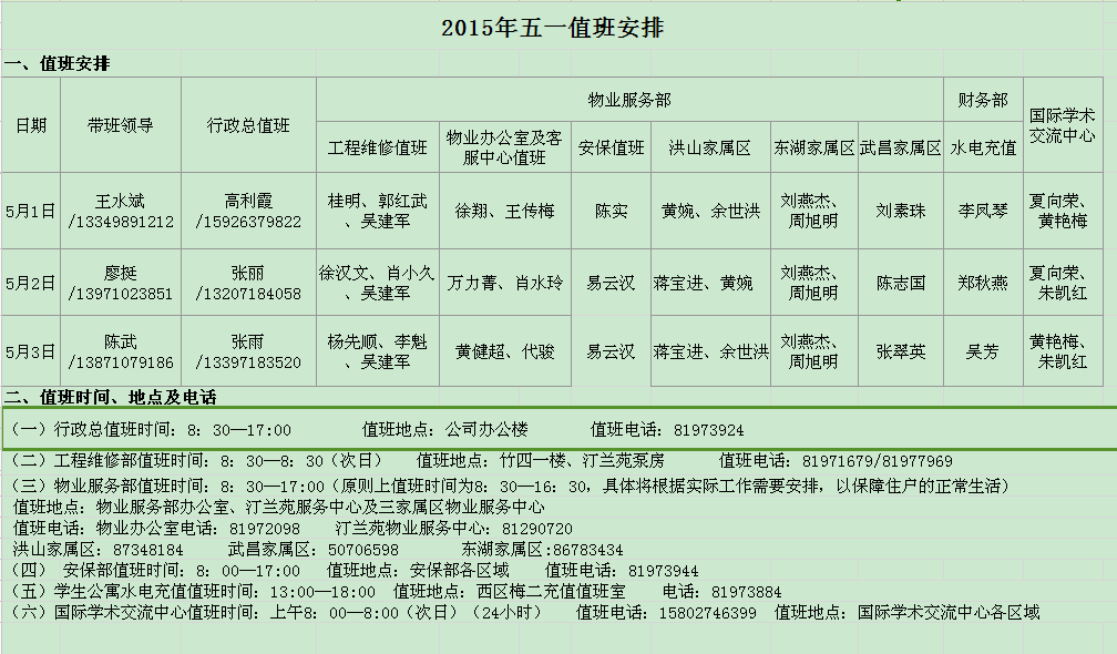 2015年五一值班安排--湖北經(jīng)濟學(xué)院-湖北億優(yōu)物業(yè)管理有限責任公司