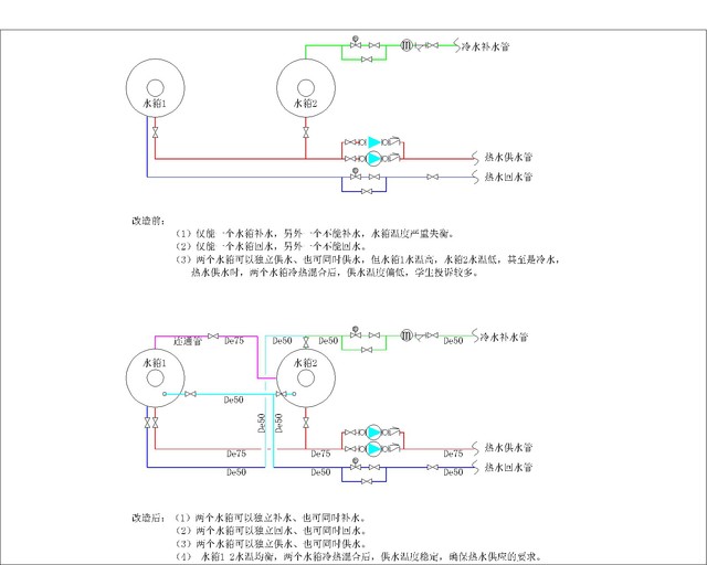 3、施工內容概述:單補回水管道改造成雙水箱同時補回水管道并增設閥門等安裝