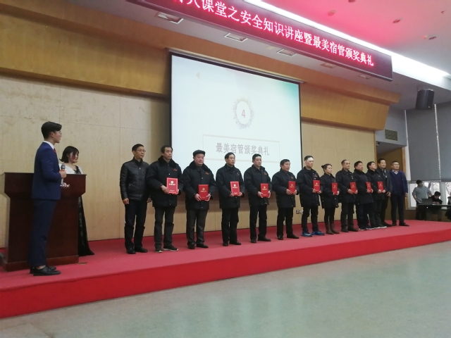 本網訊(通訊員 劉丹)學生公寓是學校育人的第二課堂,對學生的成長成才起著舉足輕重的作用。為提高學生公寓管理服務水平,推進平安校園建設,12月14日下午,億優物業公司、共青團湖北經濟學院委員會、法商學院聯合舉辦的“第二育人課堂之安全知識講座暨最美宿管頒獎典禮”在學術交流中心二號報告廳舉行。湖北經濟學院團委副書記車純賢、法商學院黨委副書記楊宏斌、學工部部長呂學斌、億優公司總經理來靖德、黨總支書記王水斌、副總經理陳武等出席了本次活動。