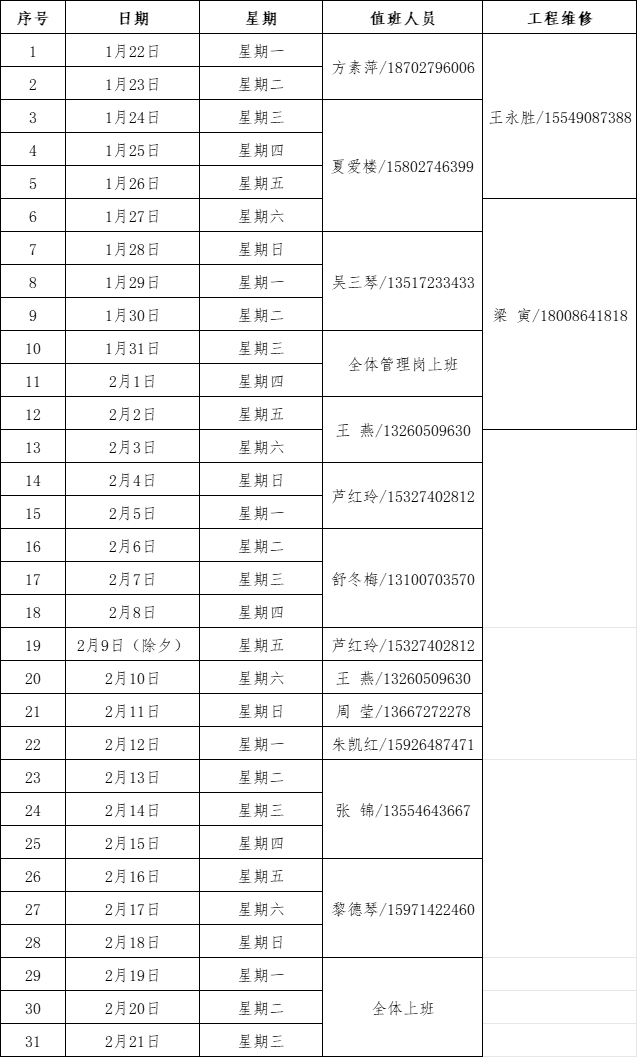 四、工程維修部值班安排(值班電話:81973944)