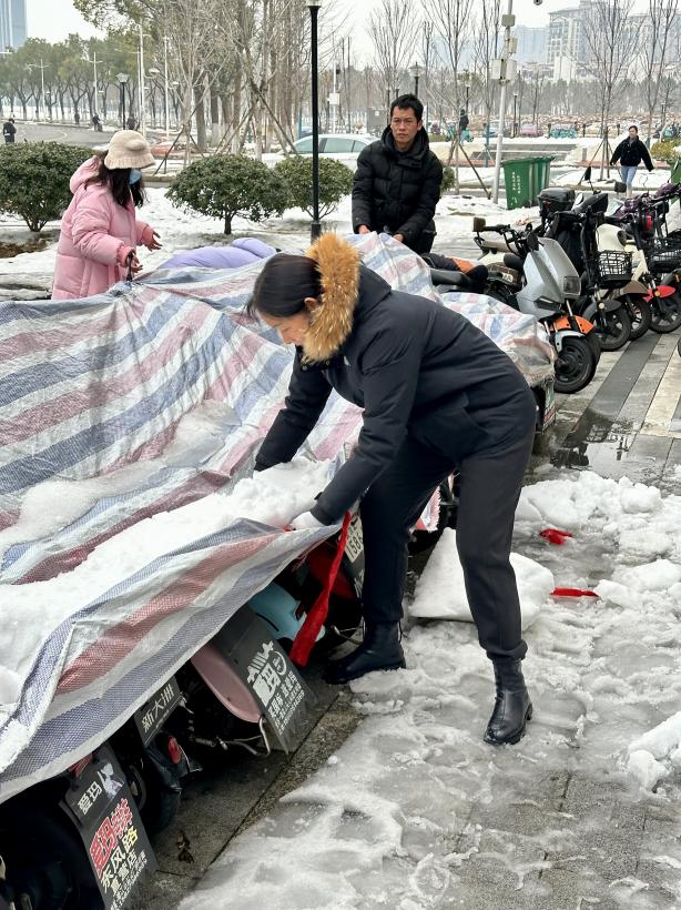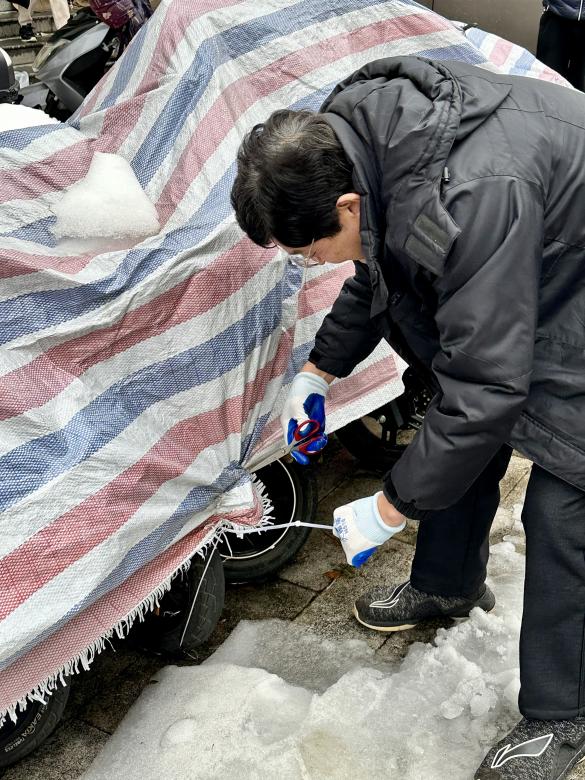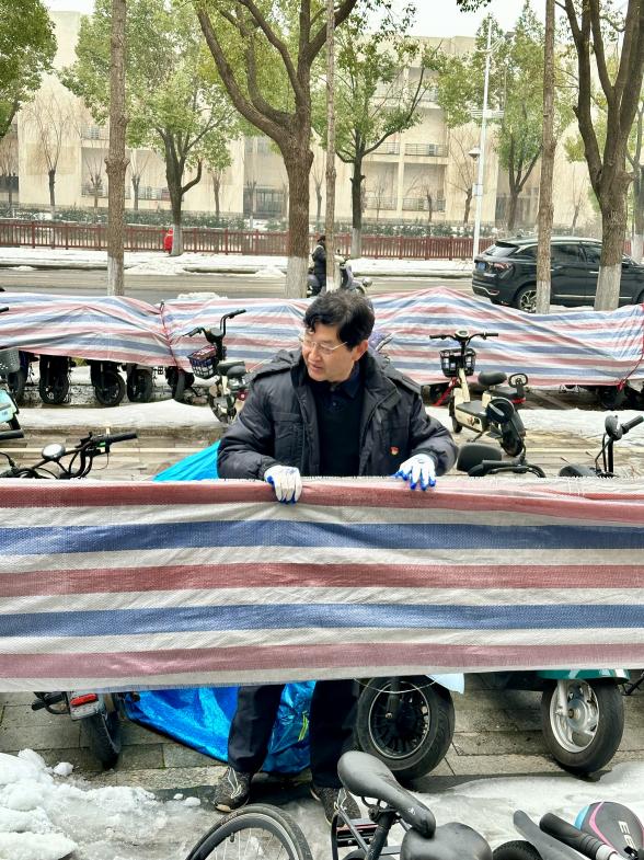 由于寒假期間天氣惡劣,遮雨布上覆蓋一層厚厚的霰,增加了本次志愿服務活動的難度。活動伊始,全體黨員緊密配合,一組黨員手持剪刀,將遮雨布與非機動車繩索固定處剪斷,另一組黨員緊跟其后,將遮雨布上的霰清理下來,隨后合作將遮雨布整齊疊好,雖然天寒地凍,大家干勁十足,工作熱情絲毫不打折扣。